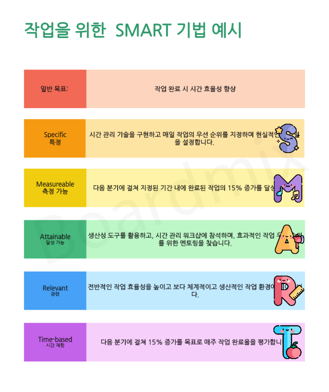 이때, SMART 기법을 활용하여 구체적이고 측정 가능하며, 달성 가능하고, 관련성이 있으며, 시간 기반의 목표를 설정하는 것이 중요하답니다.